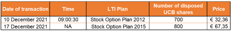 In accordance with article 8:6 of the Royal Decree executing the Belgian Code of Companies and Associations, UCB announces that, following exercises of stock options by members of its personnel, it has disposed of UCB shares OTC in view of deliveries of these shares to the relevant members of the personnel, within the framework of the Long Term Incentive Program of the UCB Group, as follows: