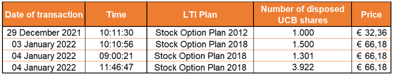 In accordance with article 8:6 of the Royal Decree executing the Belgian Code of Companies and Associations, UCB announces that, following exercises of stock options by members of its personnel, it has disposed of UCB shares OTC in view of deliveries of these shares to the relevant members of the personnel, within the framework of the Long Term Incentive Program of the UCB Group, as follows: