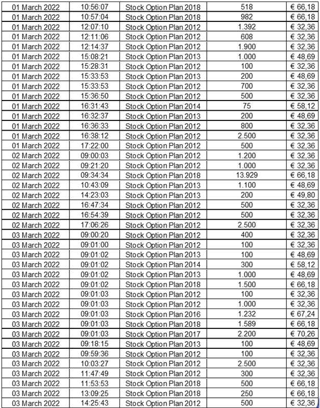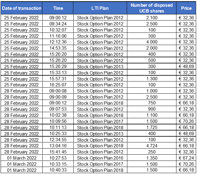In addition to these exercises, on 2 March 2022, in accordance with the vesting rules under its 2020 and 2021 LTI plans, UCB SA/NV has delivered for free a total of 328 UCB shares OTC to 2 members of the personnel of the Company and its subsidiaries. The highest independent bid price on Euronext Brussels on 2 March 2022 was € 99,82.