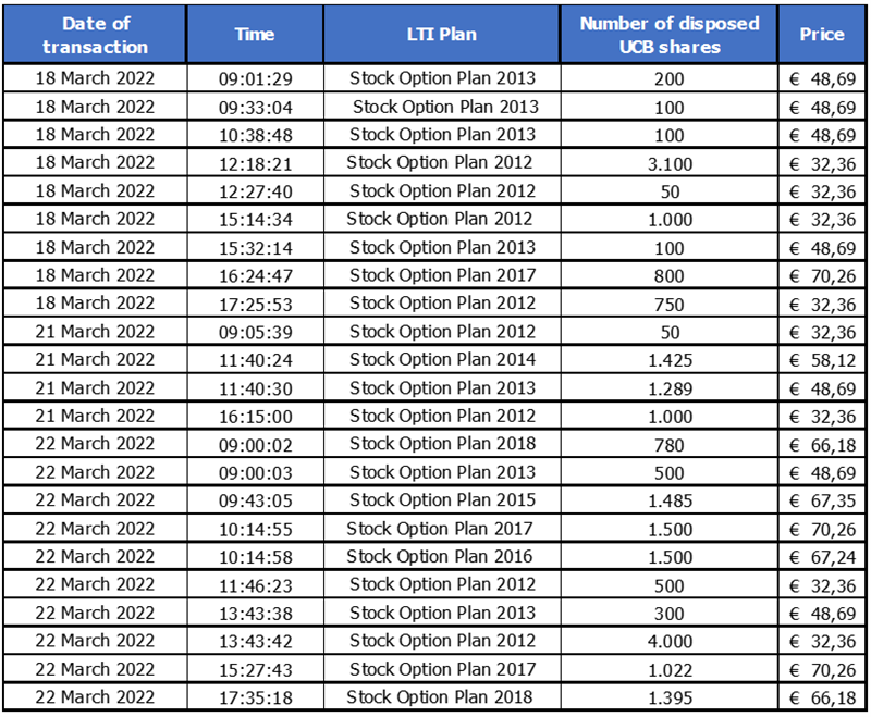 In accordance with article 8:6 of the Royal Decree executing the Belgian Code of Companies and Associations, UCB announces that, following exercises of stock options by members of its personnel, it has disposed of UCB shares OTC in view of deliveries of these shares to the relevant members of the personnel, within the framework of the Long-Term Incentive Program of the UCB Group, as follows: