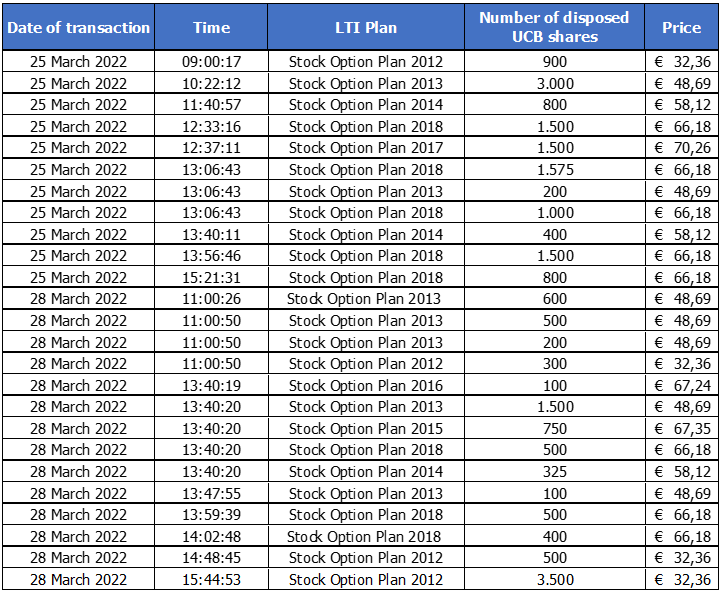In accordance with article 8:6 of the Royal Decree executing the Belgian Code of Companies and Associations, UCB announces that, following exercises of stock options by members of its personnel, it has disposed of UCB shares OTC in view of deliveries of these shares to the relevant members of the personnel, within the framework of the Long-Term Incentive Program of the UCB Group, as follows: