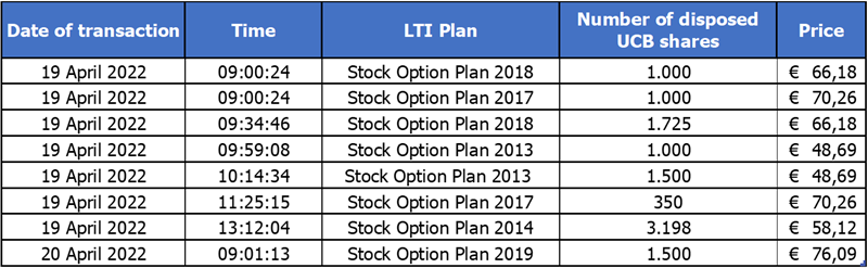 In accordance with article 8:6 of the Royal Decree executing the Belgian Code of Companies and Associations, UCB announces that, following exercises of stock options by members of its personnel, it has disposed of UCB shares OTC in view of deliveries of these shares to the relevant members of the personnel, within the framework of the Long-Term Incentive Program of the UCB Group, as follows: