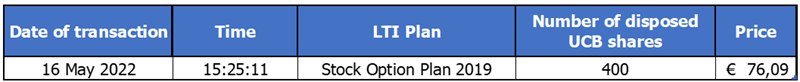 In accordance with article 8:6 of the Royal Decree executing the Belgian Code of Companies and Associations, UCB announces that, following an exercise of stock options by a member of its personnel, it has disposed of UCB shares OTC in view of deliveries of these shares to the relevant member of the personnel, within the framework of the Long-Term Incentive Program of the UCB Group, as follows: