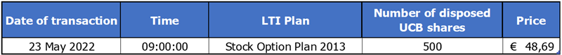 In accordance with article 8:6 of the Royal Decree executing the Belgian Code of Companies and Associations, UCB announces that, following an exercise of stock options by a member of its personnel, it has disposed of UCB shares OTC in view of deliveries of these shares to the relevant member of the personnel, within the framework of the Long-Term Incentive Program of the UCB Group, as follows: