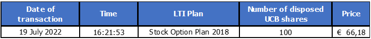 In the framework of this Share Repurchase Program 2022, UCB repurchased 89 724 UCB shares on Euronext Brussels in the period from 15 July 2022 up to and including 19 July 2022, as follows: