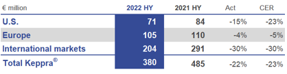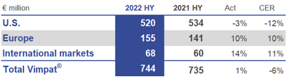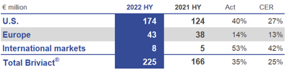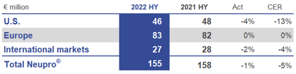 Profit decreased to € 399 million (-30%; -25% CER1) also due to the higher amortization charges and fees in connection with the Zogenix acquisition. Core EPS3 were € 3.15 after € 3.40 in the first six months 2021.