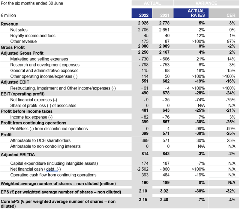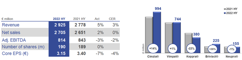 Revenue in the first six months 2022 went up by 5% (+3% CER1) to € 2 925 million and net sales reached € 2 705 million (+2%; 0% CER1). This was driven by the continued growth of UCB’s product portfolio, namely CIMZIA® and BRIVIACT®, BIMZELX® being launched now in Europe, the UK, Japan and Canada and by the addition of FINTEPLA® following the acquisition of Zogenix.