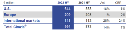 CIMZIA® (certolizumab pegol), for people living with inflammatory TNF-mediated diseases, went up by 14% (+7% CER), outperforming the anti-TNF market based on strong differentiation and driven by continued growth in all markets, namely in the U.S. and strong growth in international markets, reaching more patients.