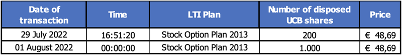 In addition to these exercises, on 1 August 2022, in accordance with the vesting rules under its 2019, 2020 and 2021 LTI plan, UCB SA/NV has delivered for free a total of 7 984 UCB shares OTC to 10 members of the personnel of the Company and its subsidiaries. The highest independent bid price on Euronext Brussels on 1 August 2022 was € 79.28.